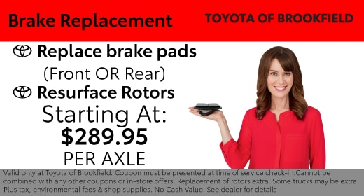 Every vehicle that is servicedĀ at Toyota of Brookfield goes through a multi-point inspection, including checking the braking system. This includes checking the brake fluid, brake pads, brake rotors, and other components. If you believe you need brake service, it is important to contact us as soon as you canĀ to diagnose the issue and get your brakes repaired right away. Waiting to service your brakes can necessitate additional work and is a safety concern.Ā