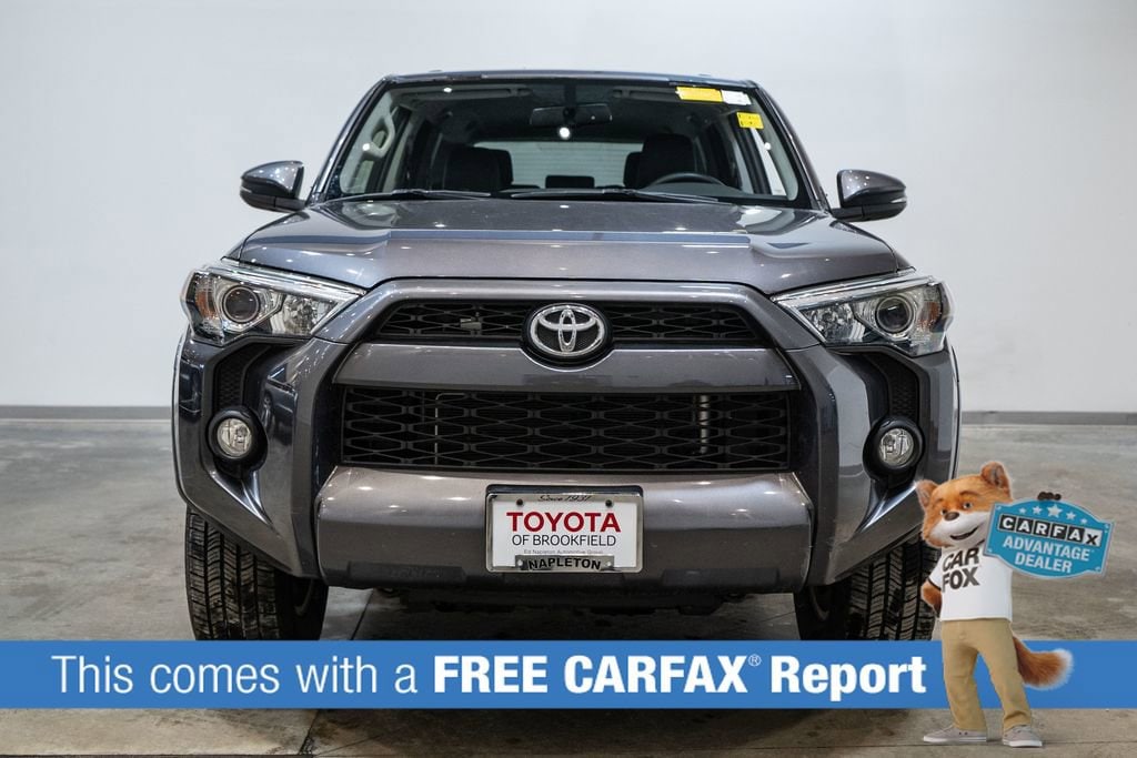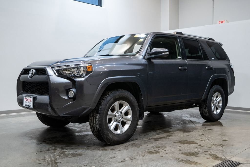 This 4Runner is well equipped with SR5 Premium Package w/Softex (Auto-Dimming Rear-View Mirror, Body Color Heated Mirrors, and Garage Door Opener), Toyota Silver Certified Certified, 4WD, Black Graphite w/Softex Synthetic Leather Seat Trim, 17 x 7.0 6-Spoke Alloy Wheels, ABS brakes, Alloy wheels, Compass, Electronic Stability Control, Heated door mirrors, Heated Front Bucket Seats, Heated front seats, Illuminated entry, Low tire pressure warning, Remote keyless entry, Traction control, 3.727 Axle Ratio, 4-Wheel Disc Brakes, 8 Speakers, Air Conditioning, AM/FM radio: SiriusXM, Anti-whiplash front head restraints, Auto-dimming Rear-View mirror, Brake assist, Bumpers: body-color, CD player, Driver door bin, Driver vanity mirror, Dual front impact airbags, Dual front side impact airbags, Emergency communication system: Safety Connect, Exterior Parking Camera Rear, Front anti-roll bar, Front Bucket Seats, Front Center Armrest, Front fog lights, Front reading lights, Front wheel independent suspension, Garage door transmitter: HomeLink, Knee airbag, Leather Shift Knob, Leather steering wheel, Occupant sensing airbag, Outside temperature display, Overhead airbag, Overhead console, Panic alarm, Passenger door bin, Passenger vanity mirror, Power door mirrors, Power driver seat, Power passenger seat, Power steering, Power windows, Radio: Entune Premium Audio w/Navigation, Rear anti-roll bar, Rear seat center armrest, Rear window defroster, Rear window wiper, Roof rack: rails only, Security system, Softex Synthetic Leather Seat Trim, Speed control, Speed-sensing steering, Split folding rear seat, Spoiler, Steering wheel mounted audio controls, Tachometer, Telescoping steering wheel, Tilt steering wheel, Trip computer, Turn signal indicator mirrors, and Variably intermittent wipers.