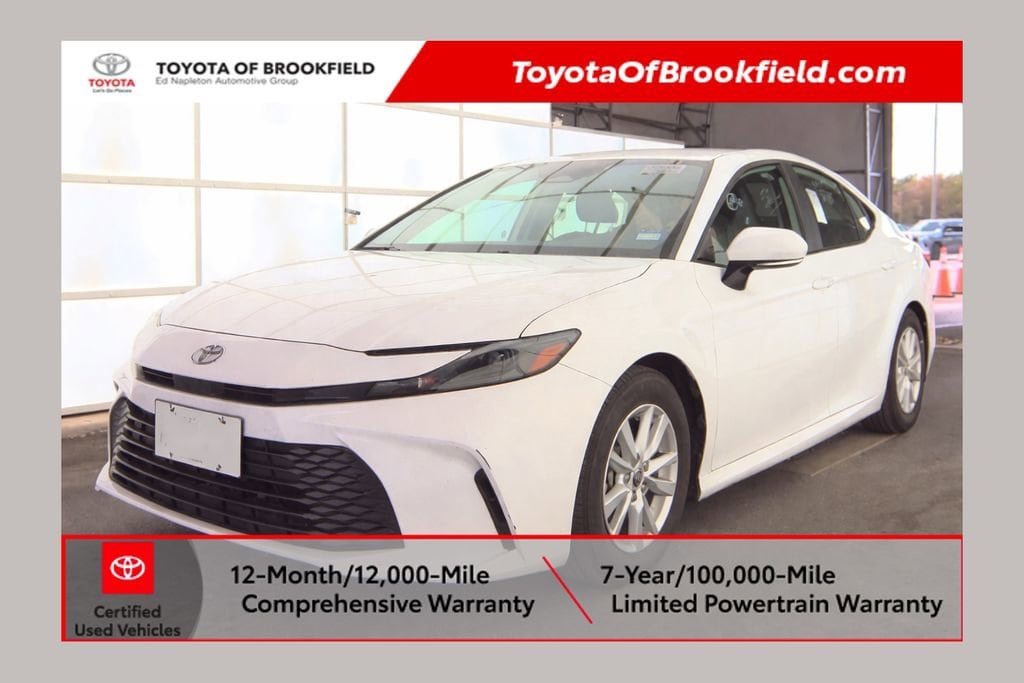 CARFAX One-Owner. Clean CARFAX. Certified. Ice Cap 2025 Toyota Camry LE FWD eCVT 2.5L 4-Cylinder 16V DOHC 2.5L 4-Cylinder 16V DOHC, Black Cloth, Active Cruise Control, Apple CarPlay/Android Auto, Auto High-beam Headlights, Heated door mirrors, Illuminated entry, Remote keyless entry.