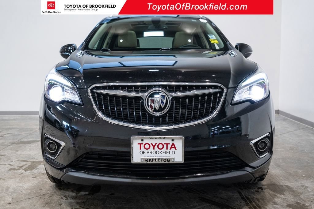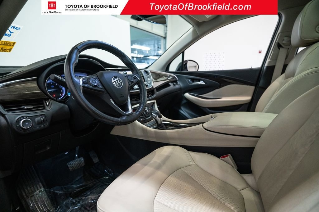 This Envision is well equipped with Preferred Equipment Group 1SL, 18 10-Spoke Polished Aluminum Wheels, 3.50 Final Drive Axle Ratio, 4-Wheel Disc Brakes, 6 Speakers, 6-Speaker Audio System Feature, ABS brakes, Air Conditioning, Alloy wheels, AM/FM radio: SiriusXM, Apple CarPlay/Android Auto, Auto-dimming door mirrors, Auto-dimming Rear-View mirror, Automatic temperature control, Brake assist, Bumpers: body-color, Compass, Delay-off headlights, Driver 8-Way Power Seat Adjuster, Driver door bin, Driver vanity mirror, Dual front impact airbags, Dual front side impact airbags, Dual USB Charging-Only Ports, Dual USB Ports w/Single Auxiliary Input Jack, Electronic Stability Control, Emergency communication system: OnStar and Buick connected services capable, Exterior Parking Camera Rear, Four wheel independent suspension, Front anti-roll bar, Front Bucket Seats, Front Center Armrest, Front dual zone A/C, Front fog lights, Front Passenger 8-Way Power Seat Adjuster, Front reading lights, Fully automatic headlights, Garage door transmitter, Heated door mirrors, Heated Driver & Front Passenger Seats, Heated front seats, Heated rear seats, Heated steering wheel, High-Intensity Discharge Headlights, Illuminated entry, Knee airbag, Leather Shift Knob, Low tire pressure warning, Memory seat, Memory Settings, Occupant sensing airbag, Outside temperature display, Overhead airbag, Overhead console, Panic alarm, Passenger door bin, Passenger vanity mirror, Perforated Leather-Appointed Seat Trim, Power door mirrors, Power driver seat, Power Liftgate, Power Panoramic Tilt-Sliding Moonroof (DISC), Power passenger seat, Power steering, Power windows, Radio data system, Radio: Buick Infotainment System AM/FM Stereo, Rear air conditioning, Rear anti-roll bar, Rear reading lights, Rear seat center armrest, Rear side impact airbag, Rear window defroster, Rear window wiper, Remote keyless entry, Roof rack: rails only, Security system, SiriusXM Radio, Speed control, Speed-sensing steering, Split folding rear seat, Spoiler, Steering wheel mounted audio controls, Tachometer, Telescoping steering wheel, Tilt steering wheel, Traction control, Trip computer, Turn signal indicator mirrors, and Variably intermittent wipers.