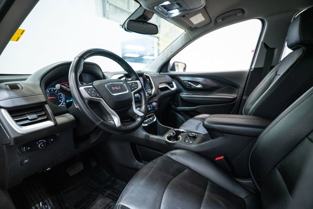 This Terrain is well equipped with Preferred Equipment Group 4SA, AWD, Auto High-beam Headlights, Heated front seats, Perforated Leather-Appointed Seat Trim, Power Liftgate, Wheels: 18 x 7 Silver Painted Aluminum, Wireless Apple CarPlay/Wireless Android Auto, 2 USB Data Ports, 2 USB Data Ports w/SD Card Reader, 3.47 Final Drive Axle Ratio, 4-Wheel Disc Brakes, 6 Speakers, 6-Speaker Audio System Feature, 6-Way Power Front Passenger Seat, 8-Way Power Driver Seat Adjuster, ABS brakes, Air Conditioning, Alloy wheels, AM/FM radio: SiriusXM, Auto-dimming Rear-View mirror, Automatic temperature control, Bluetooth® For Phone, Brake assist, Bumpers: body-color, Compass, Delay-off headlights, Deleted 3 Years of Remote Access, Driver & Front Passenger Heated Seats, Driver door bin, Driver vanity mirror, Dual front impact airbags, Dual front side impact airbags, Electronic Stability Control, Emergency communication system: OnStar and GMC connected services capable, Four wheel independent suspension, Front anti-roll bar, Front Bucket Seats, Front Center Armrest, Front dual zone A/C, Front fog lights, Front Passenger 2-Way Power Lumbar, Front reading lights, Fully automatic headlights, Garage door transmitter, Heated door mirrors, Heated steering wheel, Illuminated entry, Low tire pressure warning, Memory seat, Occupant sensing airbag, Outside temperature display, Overhead airbag, Overhead console, Panic alarm, Passenger door bin, Passenger vanity mirror, Power door mirrors, Power Driver Lumbar Control, Power driver seat, Power passenger seat, Power steering, Power windows, Radio data system, Radio: GMC Infotainment Audio System w/8 Display, Rear anti-roll bar, Rear seat center armrest, Rear window defroster, Rear window wiper, Remote keyless entry, Roof rack: rails only, Security system, SiriusXM, Speed control, Speed-sensing steering, Split folding rear seat, Spoiler, Steering wheel mounted audio controls, Tachometer, Telescoping steering wheel, Tilt steering wheel, Traction control, Trip computer, Turn signal indicator mirrors, and Variably intermittent wipers.