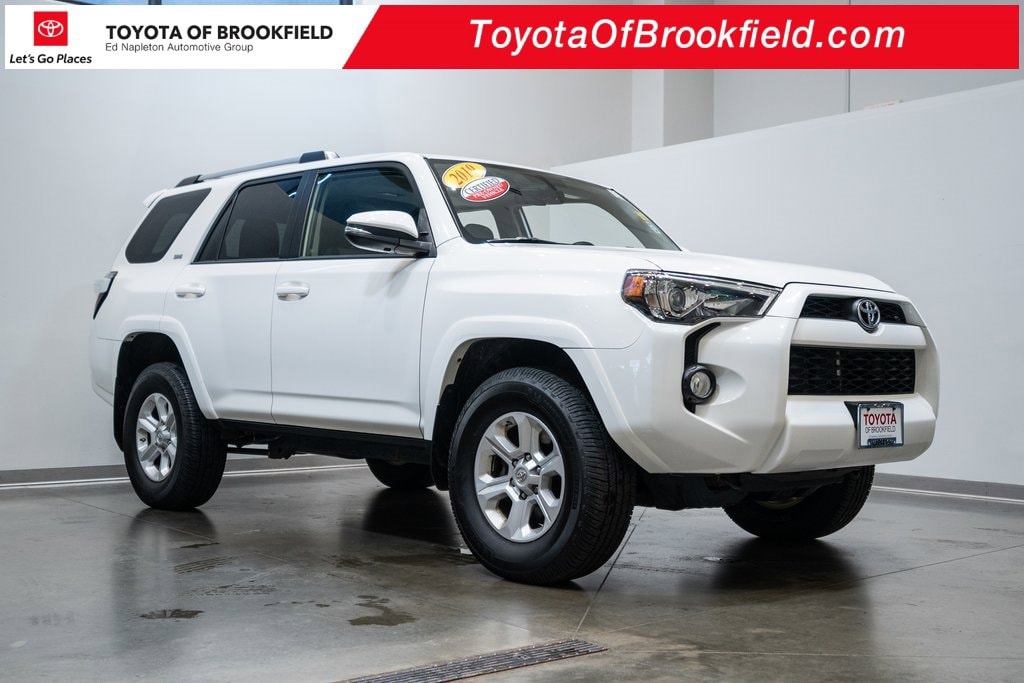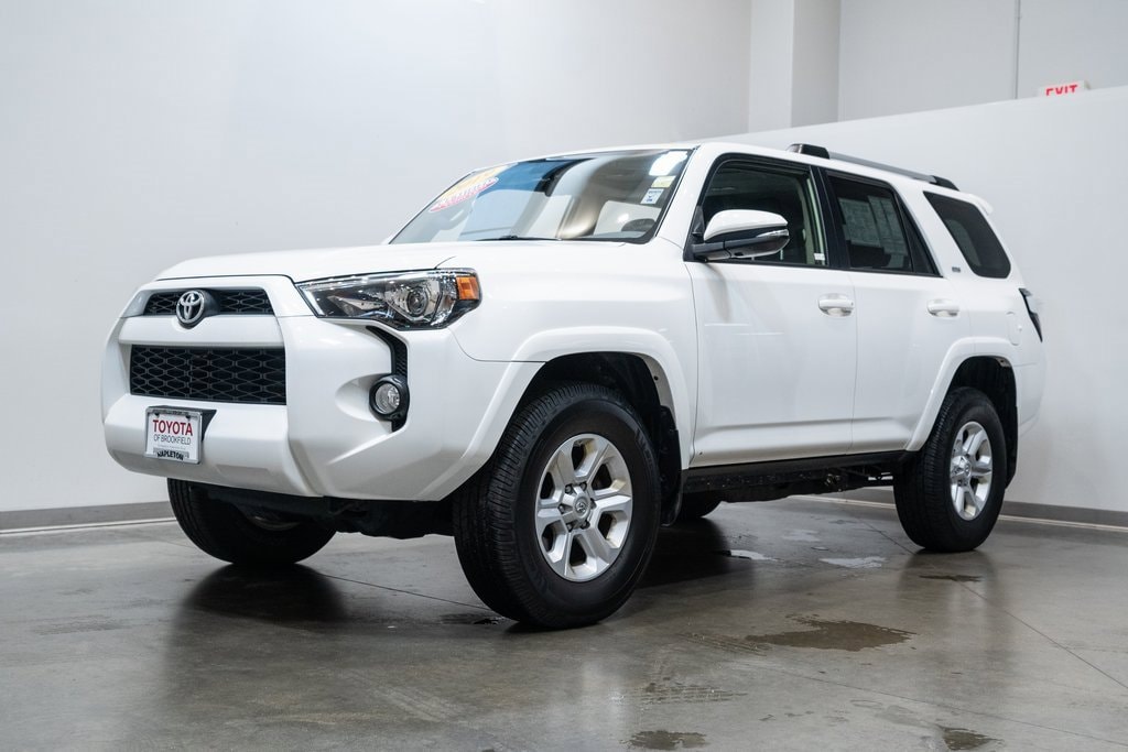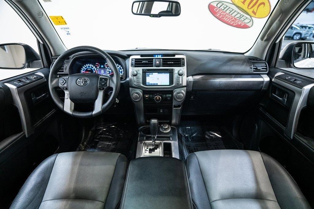 This 4Runner is well equipped with SR5 Premium Package w/Softex (Auto-Dimming Rear-View Mirror, Body Color Heated Mirrors, and Garage Door Opener), Toyota Silver Certified Certified, 4WD, Black Graphite w/Softex Synthetic Leather Seat Trim, 17 x 7.0 6-Spoke Alloy Wheels, ABS brakes, Alloy wheels, Compass, Electronic Stability Control, Heated door mirrors, Heated Front Bucket Seats, Heated front seats, Illuminated entry, Low tire pressure warning, Moonroof w/Tilt Up & Slide, Power Tilt/Slide Moonroof w/Sunshade, Remote keyless entry, Traction control, 3.727 Axle Ratio, 4-Wheel Disc Brakes, 8 Speakers, Air Conditioning, AM/FM radio: SiriusXM, Anti-whiplash front head restraints, Auto-dimming Rear-View mirror, Brake assist, Bumpers: body-color, CD player, Driver door bin, Driver vanity mirror, Dual front impact airbags, Dual front side impact airbags, Emergency communication system: Safety Connect, Exterior Parking Camera Rear, Front anti-roll bar, Front Bucket Seats, Front Center Armrest, Front fog lights, Front reading lights, Front wheel independent suspension, Garage door transmitter: HomeLink, Knee airbag, Leather Shift Knob, Leather steering wheel, Occupant sensing airbag, Outside temperature display, Overhead airbag, Overhead console, Panic alarm, Passenger door bin, Passenger vanity mirror, Power door mirrors, Power driver seat, Power passenger seat, Power steering, Power windows, Radio: Entune Premium Audio w/Navigation, Rear anti-roll bar, Rear seat center armrest, Rear window defroster, Rear window wiper, Roof rack: rails only, Security system, Softex Synthetic Leather Seat Trim, Speed control, Speed-sensing steering, Split folding rear seat, Spoiler, Steering wheel mounted audio controls, Tachometer, Telescoping steering wheel, Tilt steering wheel, Trip computer, Turn signal indicator mirrors, and Variably intermittent wipers.