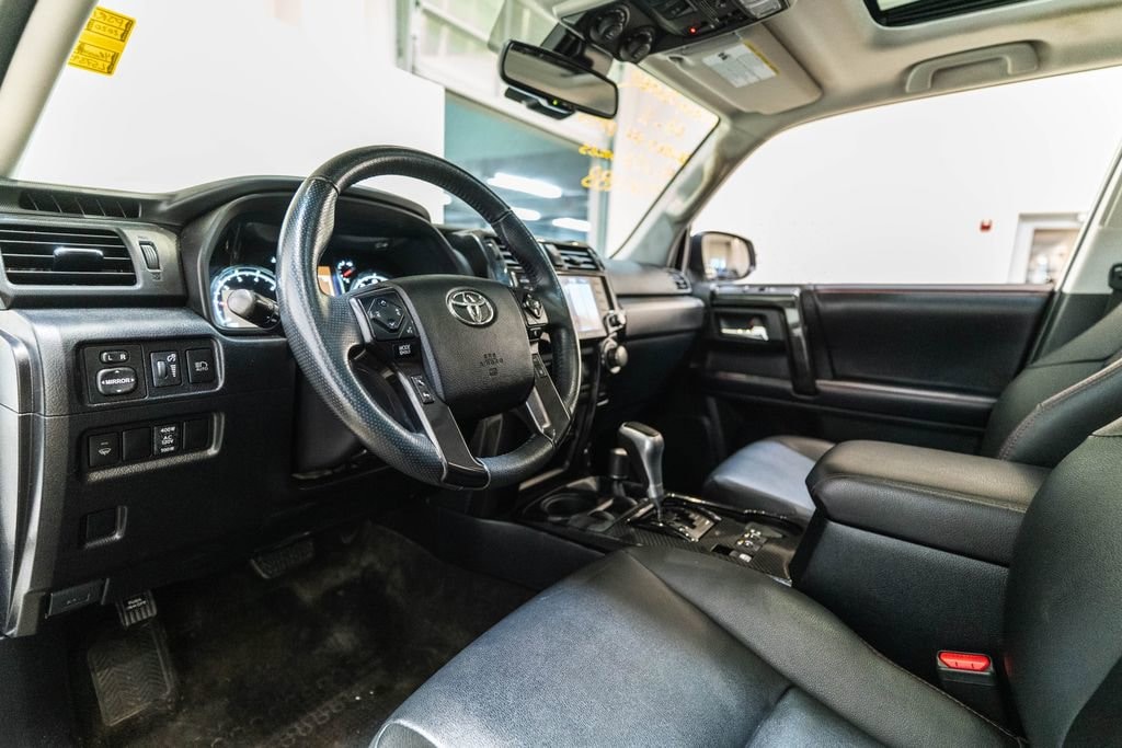 This 4Runner is well equipped with 4WD, Black/Graphite Leather, Apple CarPlay/Android Auto, Auto-dimming Rear-View mirror, Electronic Stability Control, Heated door mirrors, Heated Front Bucket Seats, Illuminated entry, Navigation System, Remote keyless entry, Wheels: 17 x 7.5 7-Spoke Unique Off-Road Alloy, 3.727 Axle Ratio, 4-Wheel Disc Brakes, 8 Speakers, ABS brakes, Active Cruise Control, Air Conditioning, Alloy wheels, AM/FM radio: SiriusXM, Anti-whiplash front head restraints, Auto High-beam Headlights, Black Roof Rails, Body Color Heated Mirrors, Brake assist, Bumpers: body-color, Compass, Driver door bin, Driver vanity mirror, Dual front impact airbags, Dual front side impact airbags, Emergency communication system: Safety Connect with 1-year trial, Exterior Parking Camera Rear, Front anti-roll bar, Front Bucket Seats, Front Center Armrest, Front fog lights, Front reading lights, Front wheel independent suspension, Garage Door Opener, Garage door transmitter: HomeLink, Heated front seats, Knee airbag, Leather Shift Knob, Low tire pressure warning, Occupant sensing airbag, Outside temperature display, Overhead airbag, Overhead console, Panic alarm, Passenger door bin, Passenger vanity mirror, Power door mirrors, Power driver seat, Power passenger seat, Power steering, Power windows, Radio: Premium Audio w/Dynamic Navigation, Rear anti-roll bar, Rear seat center armrest, Rear window defroster, Rear window wiper, Roof rack: rails only, Security system, Softex Synthetic Leather Seat Trim, Speed control, Speed-sensing steering, Split folding rear seat, Spoiler, Steering wheel mounted audio controls, Tachometer, Telescoping steering wheel, Tilt steering wheel, Traction control, Trip computer, Turn signal indicator mirrors, and Variably intermittent wipers.