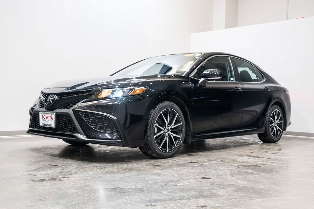 This Camry is well equipped with Cold Weather Package (Heated Exterior Mirrors, Heated Steering Wheel, and Multi-Stage Heated Front Seats), Convenience Package (Auto-Dimming Rear-View Mirror, HomeLink, and Smart Key System w/Push Button Start), Toyota Gold Certified Certified, Black w/Sport SofTex Seat Trim w/Fabric Inserts, ABS brakes, Active Cruise Control, Alloy wheels, Electronic Stability Control, Front dual zone A/C, Heated door mirrors, Illuminated entry, Low tire pressure warning, Power Tilt/Slide Moonroof, Remote keyless entry, Traction control, 4-Wheel Disc Brakes, 6 Speakers, 8.0J x 18 Alloy Wheels, Air Conditioning, AM/FM radio: SiriusXM, Apple CarPlay/Android Auto, Auto High-beam Headlights, Automatic temperature control, Brake assist, Bumpers: body-color, Delay-off headlights, Driver door bin, Driver vanity mirror, Dual front impact airbags, Dual front side impact airbags, Emergency communication system: Safety Connect (1-year trial), Exterior Parking Camera Rear, Four wheel independent suspension, Front anti-roll bar, Front Bucket Seats, Front Center Armrest, Front reading lights, Fully automatic headlights, Knee airbag, Leather steering wheel, Occupant sensing airbag, Outside temperature display, Overhead airbag, Overhead console, Panic alarm, Passenger door bin, Passenger vanity mirror, Power door mirrors, Power driver seat, Power steering, Power windows, Radio data system, Radio: Audio, Rear anti-roll bar, Rear seat center armrest, Rear side impact airbag, Rear window defroster, Security system, Speed control, Speed-sensing steering, Split folding rear seat, Spoiler, Sport SofTex Seat Trim w/Fabric Inserts, Steering wheel mounted audio controls, Tachometer, Telescoping steering wheel, Tilt steering wheel, Trip computer, Turn signal indicator mirrors, and Variably intermittent wipers.