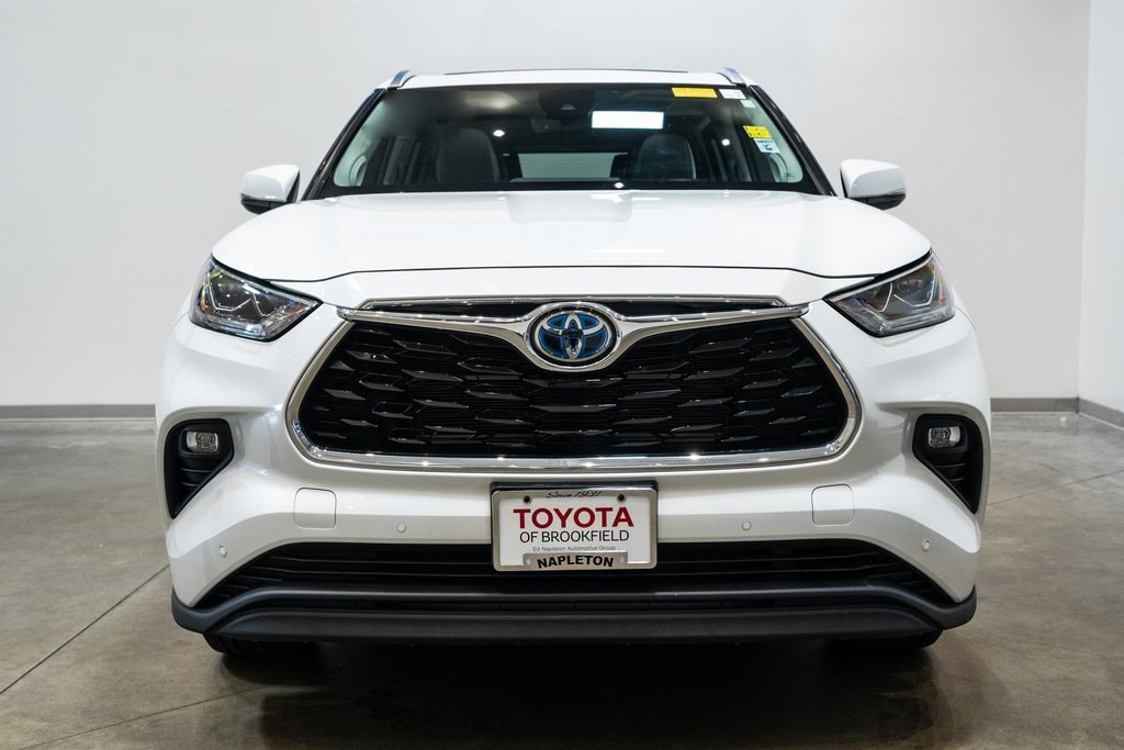 This Highlander Hybrid is well equipped with 2.5L I4 PDI Hybrid DOHC 16V LEV3-SULEV30, 11 Speakers, 20 Alloy Wheels, 3rd row seats: split-bench, 4-Wheel Disc Brakes, ABS brakes, Air Conditioning, Alloy wheels, AM/FM radio: SiriusXM, Apple CarPlay/Android Auto, Auto High-beam Headlights, Auto-dimming Rear-View mirror, Automatic temperature control, Axle Ratio: TBD, Brake assist, Bumpers: body-color, Chrome wheels, Delay-off headlights, Driver door bin, Driver vanity mirror, Dual front impact airbags, Dual front side impact airbags, Electronic Stability Control, Emergency communication system: Safety Connect (up to 10-year trial subscription), Exterior Parking Camera Rear, Four wheel independent suspension, Front anti-roll bar, Front Bucket Seats, Front Center Armrest, Front dual zone A/C, Front fog lights, Front reading lights, Fully automatic headlights, Garage door transmitter: HomeLink, Heated door mirrors, Heated Front Bucket Seats, Heated front seats, Heated steering wheel, Illuminated entry, Knee airbag, Leather Seat Trim, Leather Shift Knob, Leather steering wheel, Low tire pressure warning, Memory seat, Navigation system: Drive Connect Cloud Navigation (1-year trial subscription), Occupant sensing airbag, Outside temperature display, Overhead airbag, Overhead console, Panic alarm, Passenger door bin, Passenger vanity mirror, Power door mirrors, Power driver seat, Power Liftgate, Power moonroof, Power passenger seat, Power steering, Power windows, Radio: 12.3 Toyota Audio Multimedia w/JBL Premium, Rear air conditioning, Rear anti-roll bar, Rear reading lights, Rear window defroster, Rear window wiper, Reclining 3rd row seat, Remote keyless entry, Roof rack: rails only, Security system, Speed control, Speed-sensing steering, Split folding rear seat, Spoiler, Steering wheel mounted audio controls, Telescoping steering wheel, Tilt steering wheel, Traction control, Trip computer, Turn signal indicator mirrors, Variably intermittent wipers, and Ventilated front seats.