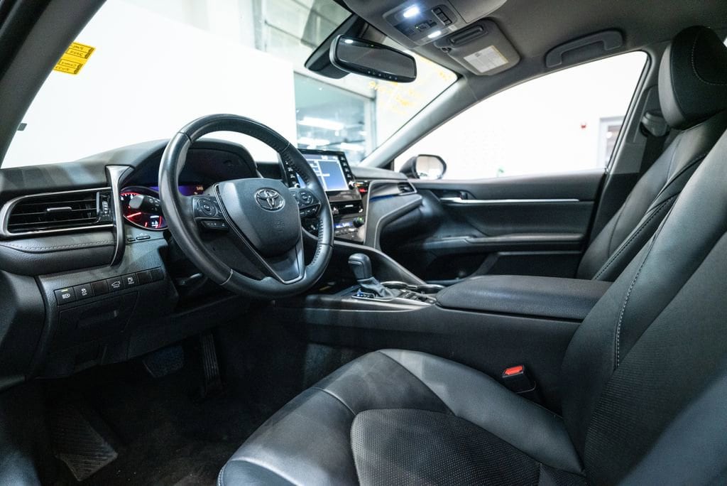 This Camry is well equipped with Black w/Perforated Leather Seat Trim, 4-Wheel Disc Brakes, 6 Speakers, ABS brakes, Air Conditioning, Alloy wheels, AM/FM radio: SiriusXM, Apple CarPlay/Android Auto, Auto High-beam Headlights, Auto-dimming Rear-View mirror, Automatic temperature control, Brake assist, Bumpers: body-color, Delay-off headlights, Driver door bin, Driver vanity mirror, Dual front impact airbags, Dual front side impact airbags, Electronic Stability Control, Emergency communication system: Safety Connect (1-year trial), Exterior Parking Camera Rear, Four wheel independent suspension, Front anti-roll bar, Front Bucket Seats, Front Center Armrest, Front dual zone A/C, Front reading lights, Fully automatic headlights, Garage door transmitter: HomeLink, Heated door mirrors, Heated front seats, Illuminated entry, Knee airbag, Leather steering wheel, Low tire pressure warning, Multi-Stage Heated Front Bucket Seats, Occupant sensing airbag, Outside temperature display, Overhead airbag, Overhead console, Panic alarm, Passenger door bin, Passenger vanity mirror, Perforated Leather Seat Trim, Power door mirrors, Power driver seat, Power passenger seat, Power steering, Power windows, Radio data system, Radio: Audio Plus, Rear anti-roll bar, Rear reading lights, Rear seat center armrest, Rear side impact airbag, Rear window defroster, Remote keyless entry, Security system, Speed control, Speed-sensing steering, Split folding rear seat, Spoiler, Steering wheel mounted audio controls, Tachometer, Telescoping steering wheel, Tilt steering wheel, Traction control, Trip computer, Turn signal indicator mirrors, Variably intermittent wipers, and Wheels: 19 x 8J Alloy.
