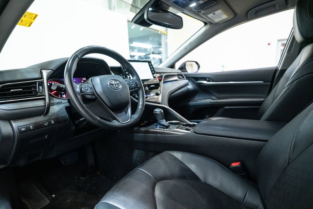This Camry is well equipped with Toyota Gold Certified Certified, Black w/Perforated Leather Seat Trim, 4-Wheel Disc Brakes, 6 Speakers, ABS brakes, Air Conditioning, Alloy wheels, AM/FM radio: SiriusXM, Apple CarPlay/Android Auto, Auto High-beam Headlights, Auto-dimming Rear-View mirror, Automatic temperature control, Brake assist, Bumpers: body-color, Delay-off headlights, Driver door bin, Driver vanity mirror, Dual front impact airbags, Dual front side impact airbags, Electronic Stability Control, Emergency communication system: Safety Connect (1-year trial), Exterior Parking Camera Rear, Four wheel independent suspension, Front anti-roll bar, Front Bucket Seats, Front Center Armrest, Front dual zone A/C, Front reading lights, Fully automatic headlights, Garage door transmitter: HomeLink, Heated door mirrors, Heated front seats, Illuminated entry, Knee airbag, Leather steering wheel, Low tire pressure warning, Multi-Stage Heated Front Bucket Seats, Occupant sensing airbag, Outside temperature display, Overhead airbag, Overhead console, Panic alarm, Passenger door bin, Passenger vanity mirror, Perforated Leather Seat Trim, Power door mirrors, Power driver seat, Power passenger seat, Power steering, Power windows, Radio data system, Radio: Audio Plus, Rear anti-roll bar, Rear reading lights, Rear seat center armrest, Rear side impact airbag, Rear window defroster, Remote keyless entry, Security system, Speed control, Speed-sensing steering, Split folding rear seat, Spoiler, Steering wheel mounted audio controls, Tachometer, Telescoping steering wheel, Tilt steering wheel, Traction control, Trip computer, Turn signal indicator mirrors, Variably intermittent wipers, and Wheels: 19 x 8J Alloy.