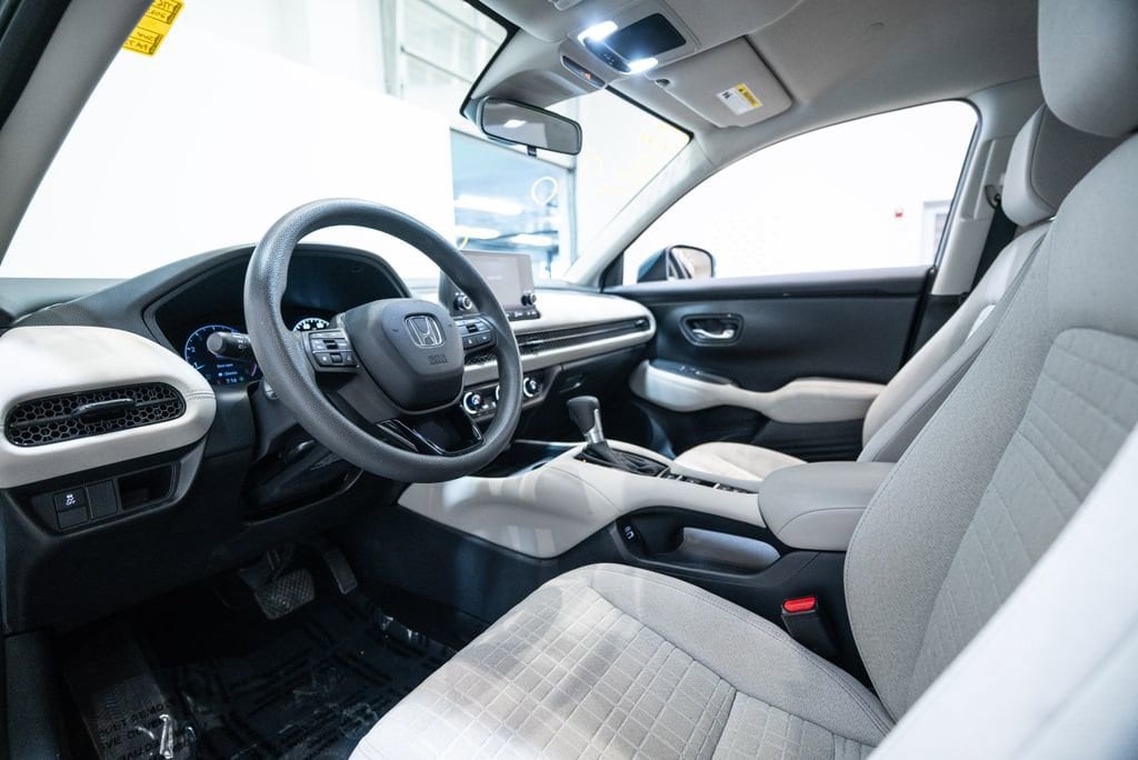 This HR-V is well equipped with Adaptive Cruise Control: Adaptive Cruise Control (ACC) with Low-Speed Follow, Apple CarPlay/Android Auto, Auto High-beam Headlights, Brake assist, Remote keyless entry, 4 Speakers, 4-Wheel Disc Brakes, 5.436 Axle Ratio, ABS brakes, Air Conditioning, Alloy wheels, AM/FM radio, Automatic temperature control, Bumpers: body-color, Cloth Seat Trim, Delay-off headlights, Driver door bin, Driver vanity mirror, Dual front impact airbags, Dual front side impact airbags, Electronic Stability Control, Emergency communication system: HondaLink, Exterior Parking Camera Rear, Four wheel independent suspension, Front anti-roll bar, Front Bucket Seats, Front Center Armrest, Front reading lights, Fully automatic headlights, Illuminated entry, Knee airbag, Low tire pressure warning, Occupant sensing airbag, Outside temperature display, Overhead airbag, Panic alarm, Passenger door bin, Passenger vanity mirror, Power door mirrors, Power steering, Power windows, Radio data system, Radio: 180-Watt Audio System w/4 Speakers, Rear anti-roll bar, Rear reading lights, Rear side impact airbag, Rear window defroster, Rear window wiper, Security system, Speed control, Speed-sensing steering, Split folding rear seat, Spoiler, Steering wheel mounted audio controls, Tachometer, Telescoping steering wheel, Tilt steering wheel, Traction control, Trip computer, Variably intermittent wipers, and Wheels: 17 Silver Painted Alloy.