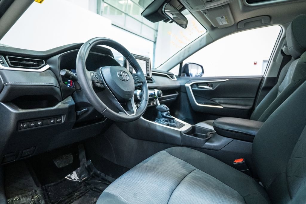 This RAV4 is well equipped with AWD, Black w/Fabric Seat Trim, 4-Wheel Disc Brakes, 6 Speakers, ABS brakes, Air Conditioning, Alloy wheels, AM/FM radio: SiriusXM, AM/FM Stereo, Apple CarPlay/Android Auto, Auto High-beam Headlights, Automatic temperature control, Axle Ratio: 3.177, Brake assist, Bumpers: body-color, Delay-off headlights, Driver door bin, Driver vanity mirror, Dual front impact airbags, Dual front side impact airbags, Electronic Stability Control, Emergency communication system: Entune Safety Connect, Exterior Parking Camera Rear, Fabric Seat Trim, Four wheel independent suspension, Front anti-roll bar, Front Bucket Seats, Front Center Armrest, Front Door Smart Key System w/Push Button Start, Front dual zone A/C, Front fog lights, Front reading lights, Fully automatic headlights, Heated door mirrors, Illuminated entry, Knee airbag, Low tire pressure warning, Occupant sensing airbag, Outside temperature display, Overhead airbag, Overhead console, Panic alarm, Passenger door bin, Passenger vanity mirror, Power door mirrors, Power driver seat, Power steering, Power windows, Radio data system, Rear anti-roll bar, Rear seat center armrest, Rear window defroster, Rear window wiper, Remote keyless entry, Roof rack: rails only, Speed control, Speed-sensing steering, Split folding rear seat, Spoiler, Steering wheel mounted audio controls, Tachometer, Telescoping steering wheel, Tilt steering wheel, Traction control, Trip computer, Turn signal indicator mirrors, Variably intermittent wipers, and Wheels: 17 5-Spoke Silver Alloy.